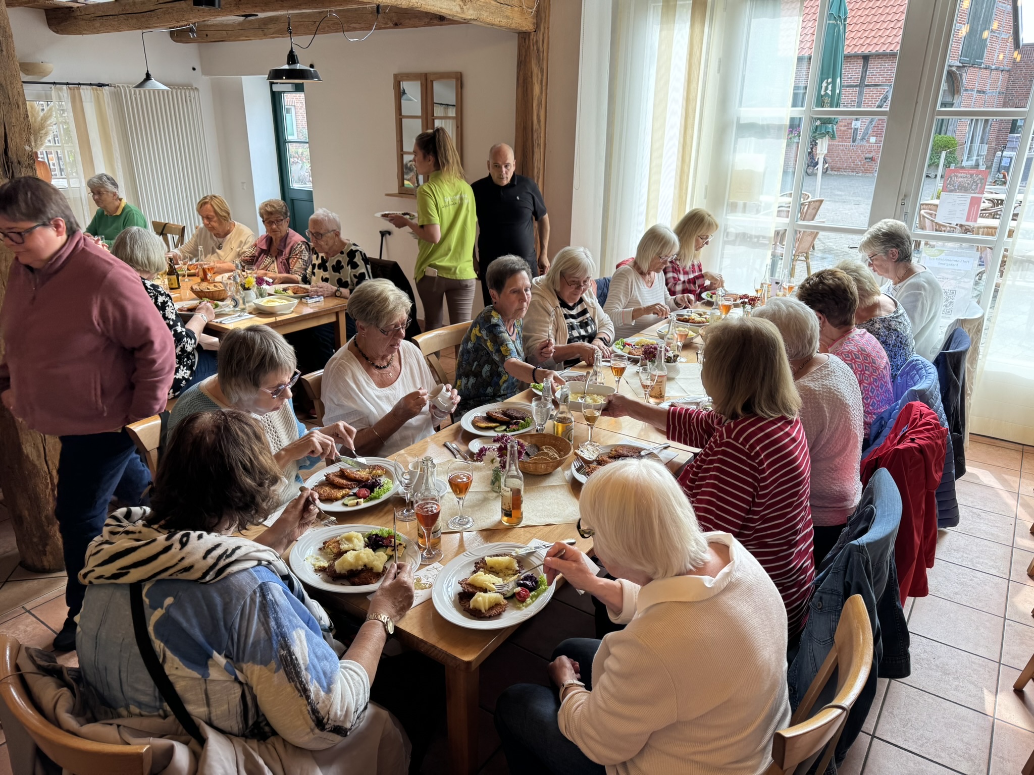 Eine kleine Auszeit vom Alltag – die nahm sich wieder eine fröhlich gelaunte Gruppe von Frauen beim Ganztagesausflug der Frauenhilfe Langenbochum – diesmal in die „Pferdestadt“ Warendorf. Bei der Führung durch das beeindruckende Landgestüt NRW erfuhren wir aber auch wirklich alles, was es zu Pferden im Allgemeinen und zum Landgestüt im Besonderen zu wissen gibt. Wer von uns kannte vorher schon die unterschiedlichen Rassen, warum die Zucht von Warm- und Kaltblütern und hier besonders des Rheinisch-deutschen Kaltbluts bedeutsam ist, Besamungstechniken oder warum Pferde eine Darmlänge von 42 m haben? Oder dass von den 22 Auszubildenden mittlerweile 21 Frauen sind? Die historischen Stallungen mit wunderschönen Gewölben sind nicht nur optisch ein Hingucker, sondern mit ihrer durchdachten Architektur auch ein Vorbild für klimagerechtes Bauen. Das Team im Café Hof Lohmann, einer integrativen Einrichtung des Caritasverbandes, verwöhnte uns mit Hausmannskost, der Hofladen lud zum Stöbern ein und so manches Erinnerungsstück wanderte mit uns in den Bus… Die anschließende Führung durch die Altstadt von Warendorf öffnete uns die Augen für „Drachenköppe“ und „Katzensteine“ sowie sehenswerte historische Gebäude. Und dass es bei dem schönen Wetter daran ging, die Eiscafés und kleinen Lädchen der Innenstadt zu erkunden, war selbstverständlich. Zum kulinarischen Ausklang des erlebnisreichen Tages gehörte das leckere Abendessen in der Pott´s Brauerei – natürlich begleitet von selbstgebrauten Bieren. Wir blicken zurück auf einen Tag, der gefüllt war mit Informativem, Spannendem und Lustigem, mit gutem Essen und manchen Leckereien, einer tollen Gemeinschaft und guten Begegnungen und Gesprächen – und freuen uns schon auf den nächsten Ausflug.