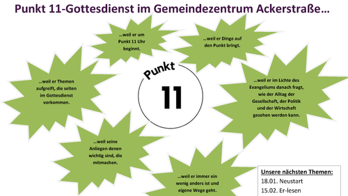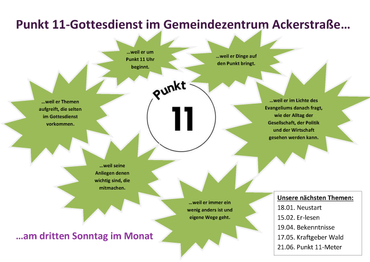 laden wir um 11.00 Uhr zum Punkt 11 Gottesdienst in die Ackerstraße 1 ein.