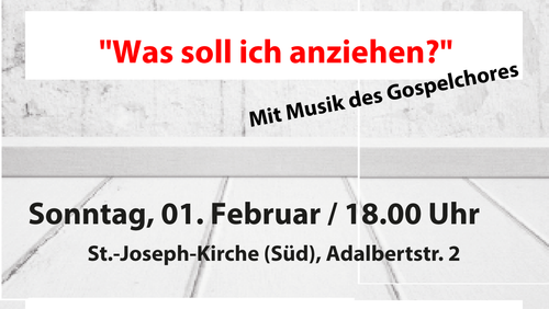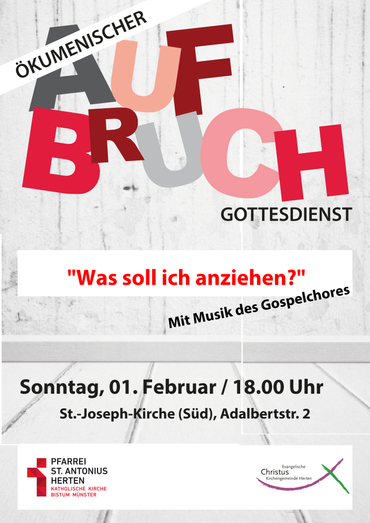 Herzliche Einladung zum ökumenischen Aufbruchgottesdienst am kommen Sonntag, 1. Februar um 18.00 Uhr in St. Jossph-Süd. Der Gottesdienst wird musikalisch vom Gospelchor der Christuskirchengemeinde begleitet.