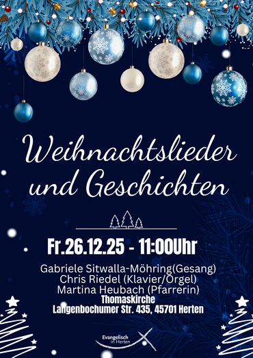 Am zweiten Weihnachtsfeiertag ist Weihnachten für die meisten von uns schon fast wieder vorbei und der Fokus liegt bereits auf dem Alltag, der vor der Tür steht. Wir wollen noch einmal innehalten, uns verzaubern lassen und dem Wunder dieses Festes nachspüren. Darum laden wir am Freitag, dem 26. Dezember 2025, um 11:00 Uhr ganz herzlich zu einem musikalischen Gottesdienst in die Thomaskirche ein. Unter dem Titel „Weihnachtslieder und Geschichten“ erwarten Sie bekannte Melodien und stimmungsvolle Texte zur Weihnachtszeit. Mit dabei sind Gabriele Sitwalla-Möhring (Gesang), Chris Riedel (Klavier) und Pfarrerin Martina Heubach, die mit Musik, kurzen Geschichten und Gedanken durch das Programm führen. Freuen Sie sich auf eine besinnliche Stunde voller Musik und Weihnachtsfreude.