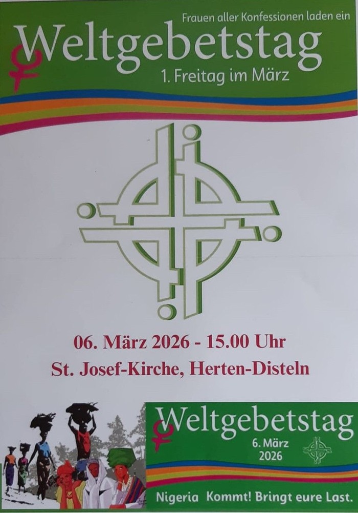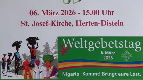 Am Freitag, 6. März, lädt das ökumenische Vorbereitungsteam zum Weltgebetstag um 15.00 Uhr in die St. Josef-Kirche in Herten Disteln ein. Dieses Jahr haben den Weltgebetstag Frauen aus Nigeria erarbeitet.