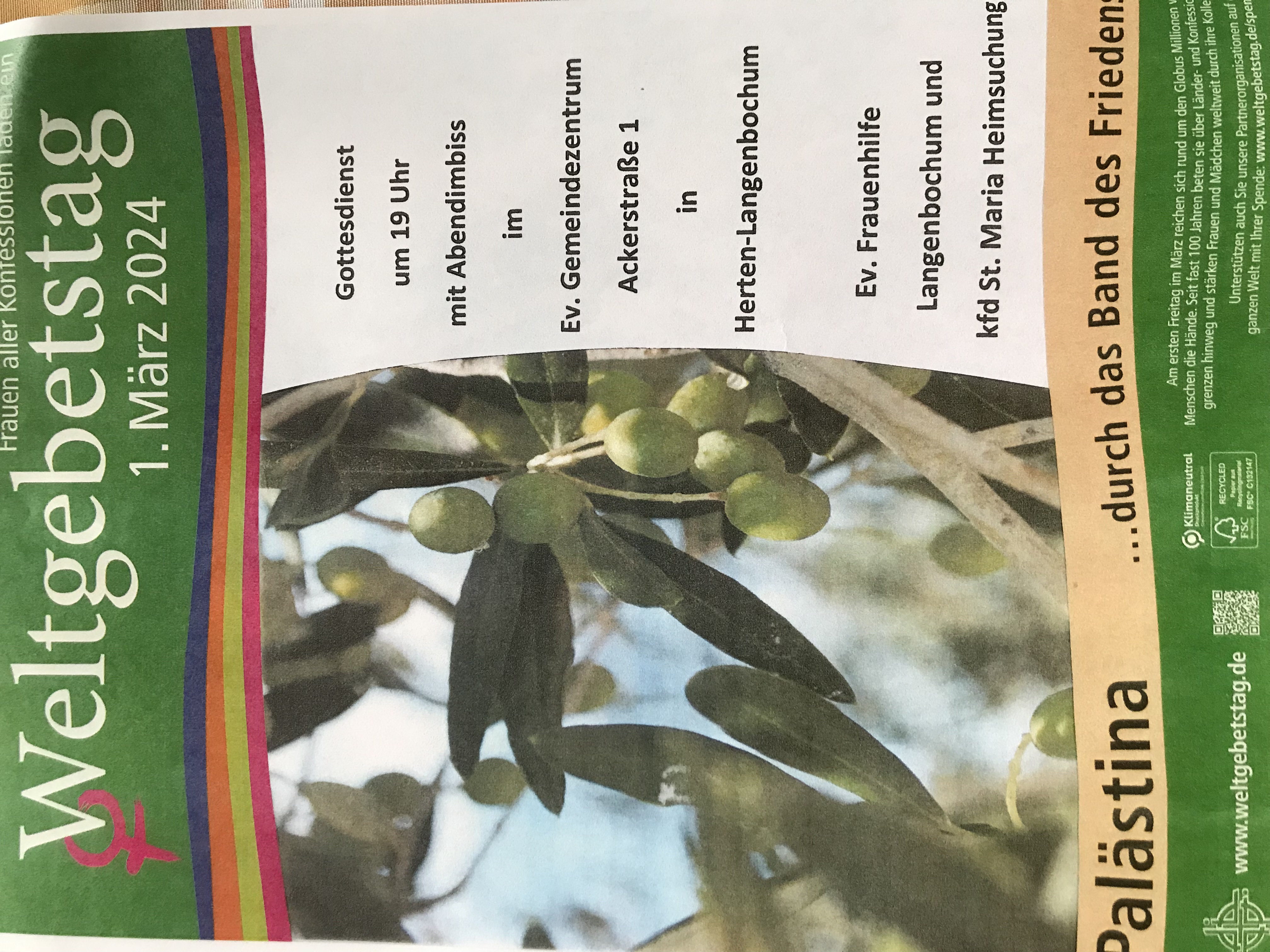 Ökumenischer Weltgebetstags-Gottesdienst! Vorbereitet vom Team Frauenhilfe Langenbochum und kfd St. Maria Heimsucheng feiern wir ihn im Gemeindezentrum Ackerstraße am Freitag, dem 6. März, um 19 Uhr. Unterstützt werden wir beim Singen der Lieder wieder vom Projektchor mit Musikgruppe unter Leitung von Angela Buschmann-Rorowski. Wie gewohnt wird es im Anschluss ein gemeinsames, landestypisches Abendessen geben. Mit Zeit für Begegnung, Austausch und gemütlichem Beisammensein. Auch hierzu unsere herzliche Einladung an Alle.