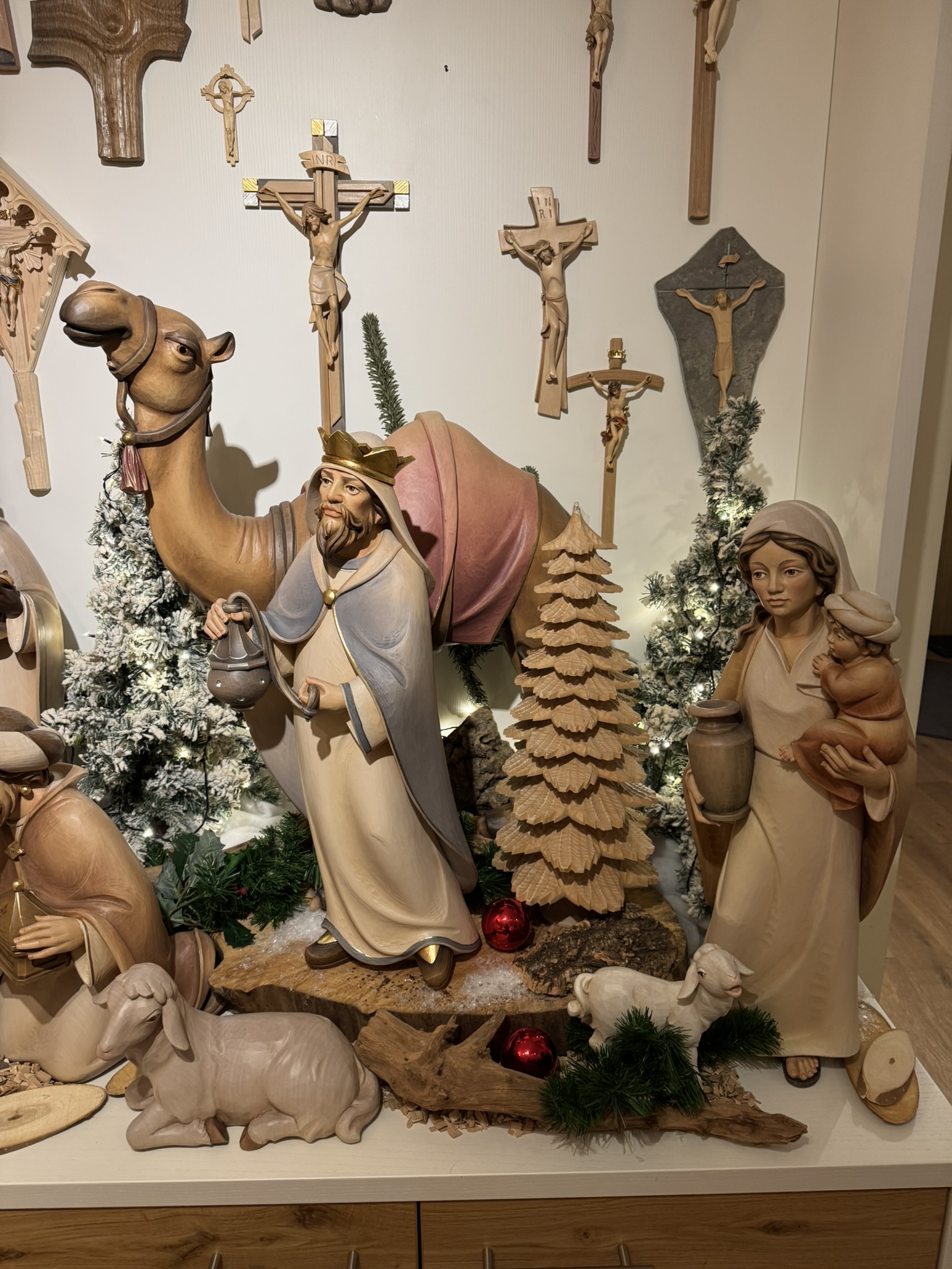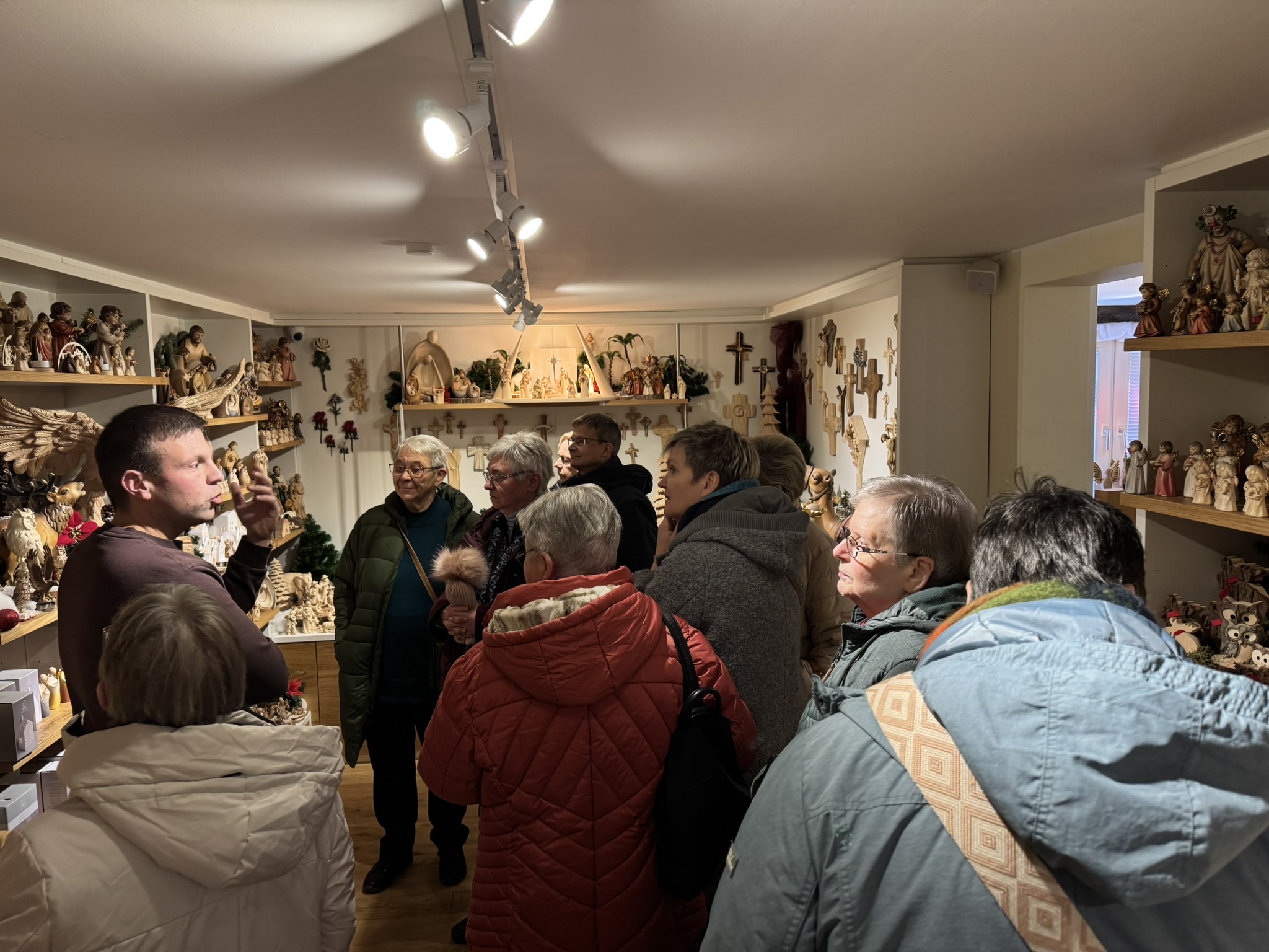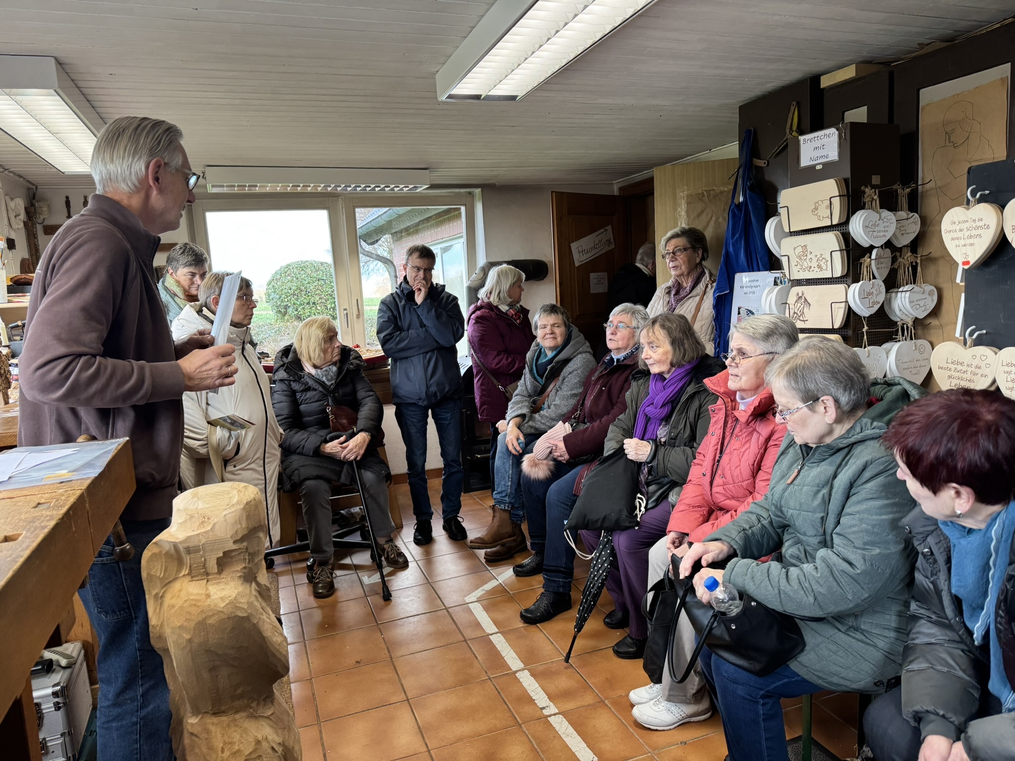 Das neue Jahr begannen wir mit einem Ausflug nach Mettingen zur Holzbildhauerei der Familie Böggemann. Ein Familien- und Handwerksbetrieb mit Spezialisierung auf Krippen und Krippenfiguren, die in einer umfangreichen, wunderschönen Ausstellung bewundert werden konnten. Während der Führung erfuhren wir so einiges über teils skurrile und bemerkenswerte Kundenwünsche, über breit gefächerte Auftragsarbeiten von modernen Skulpturen und geschnitzten Dachgiebeln an Fachwerkhäusern bis hin zu Schnitzereien an Weinfässern, über die Ausbildung und den Wandel in dieser Berufssparte in den letzten Jahren und vieles mehr. Herr Böggemann sen. bot spontan an, uns bei einer kleinen Stadtrundfahrt durch den Ort zu leiten, was wir gerne annahmen. Er erzählte uns anschaulich die Anfänge der Tuchhändlerfamilie Brenninkmeyer, deren Geschichte in der Gründung und Betreibung des Unternehmens C & A mündete, zeigte im Vorbeifahren die Anwesen dieser mittlerweile weitverzweigten internationalen Großfamilie und plauderte ein wenig „aus dem Nähkästchen“. Die Zeit verging wie im Flug.