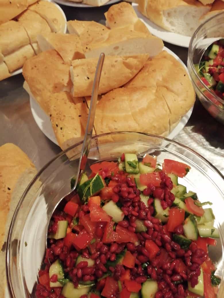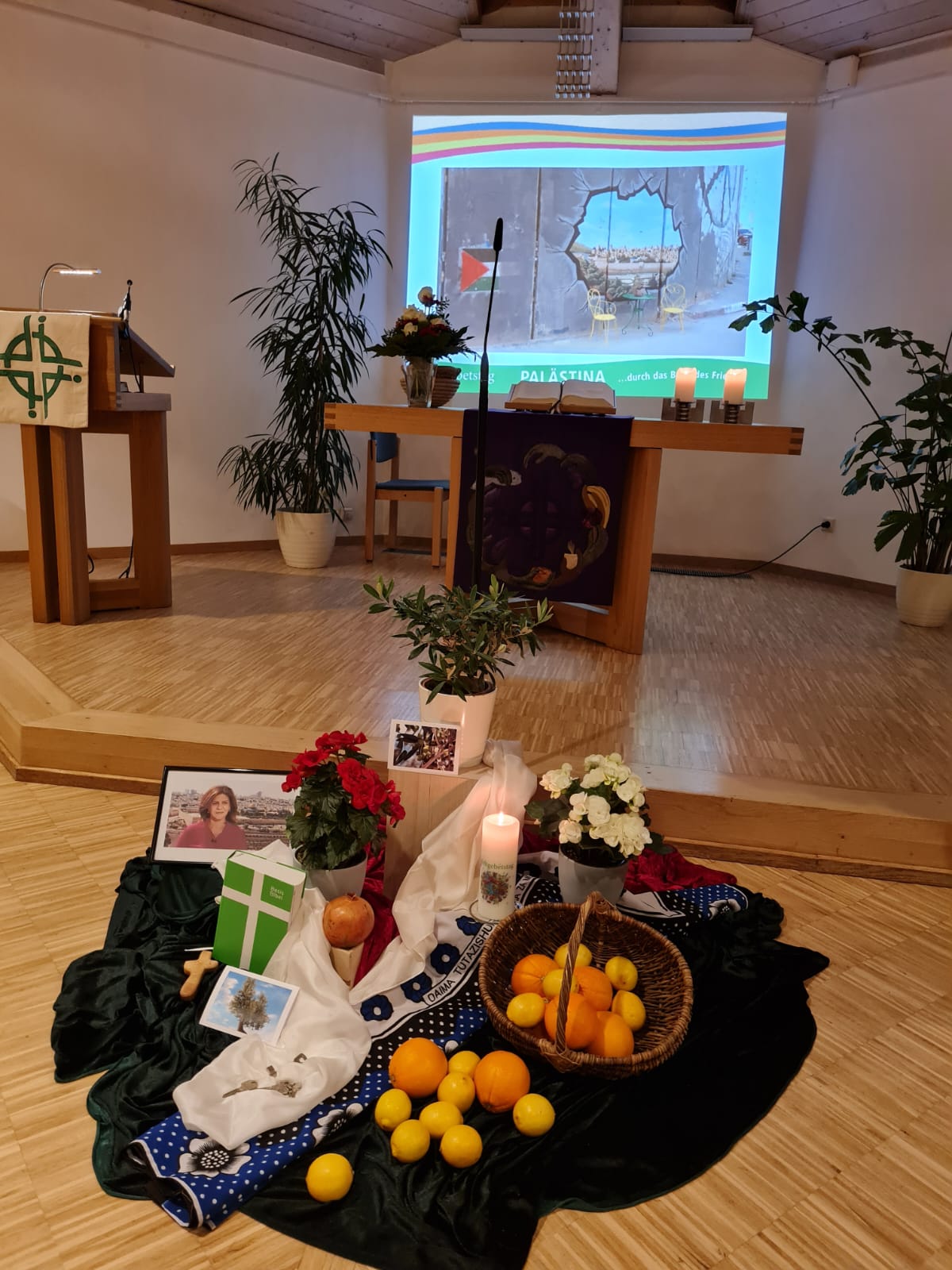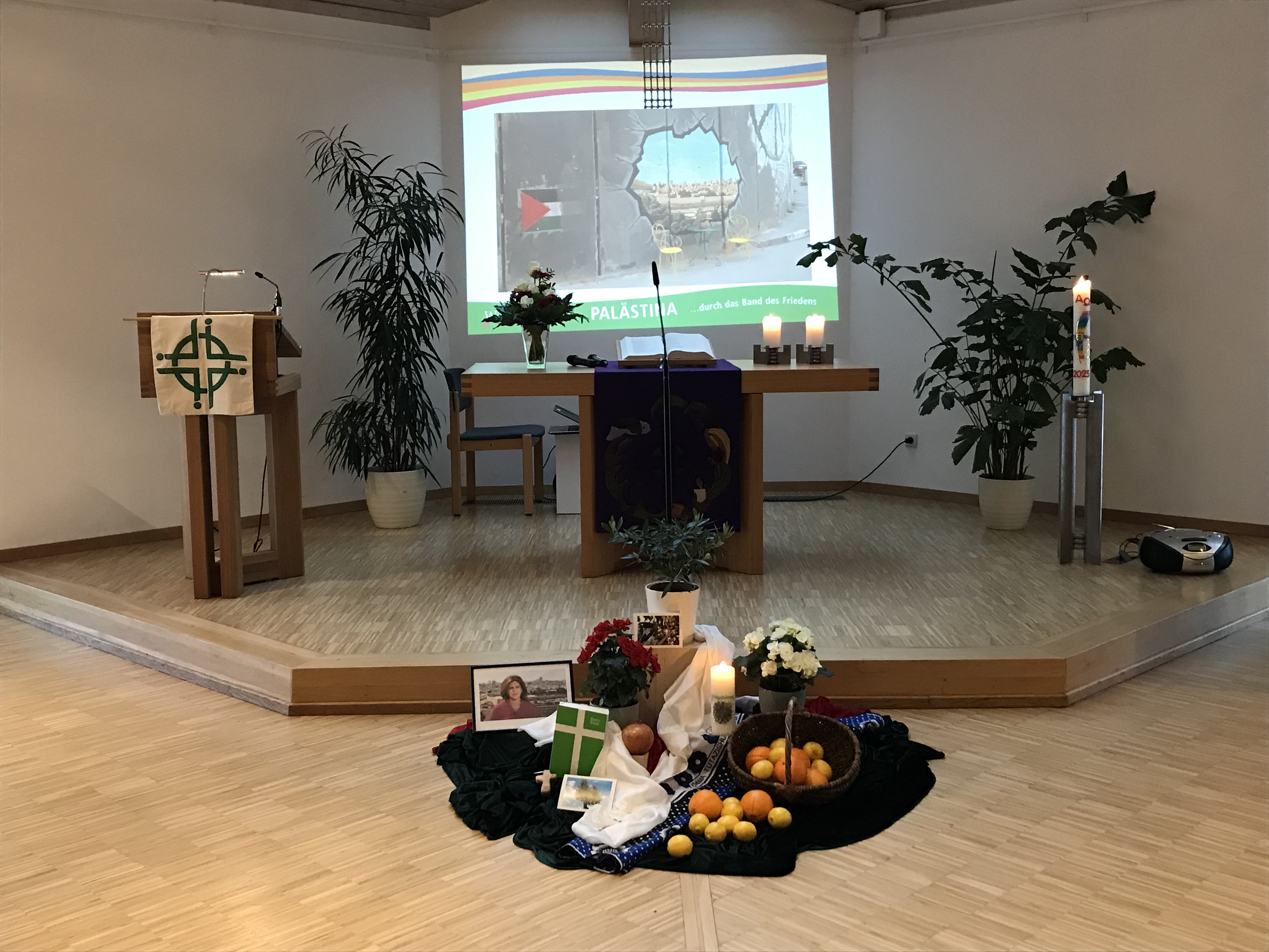 Ein herzliches Dankeschön geht an alle, die zu einer großzügigen Kollekte beigetragen haben, mit der die weltweite Projektarbeit weitergeführt werden kann. Bei einem Abendessen mit Fladenbrot, Oliven, Hummus, Falafeln und typischem Salat, dazu zum Nachtisch Granatapfelkuchen, saß ein Großteil der GottesdienstbesucherInnen noch lange bei Tisch zusammen, in lebhafte Gespräche vertieft.