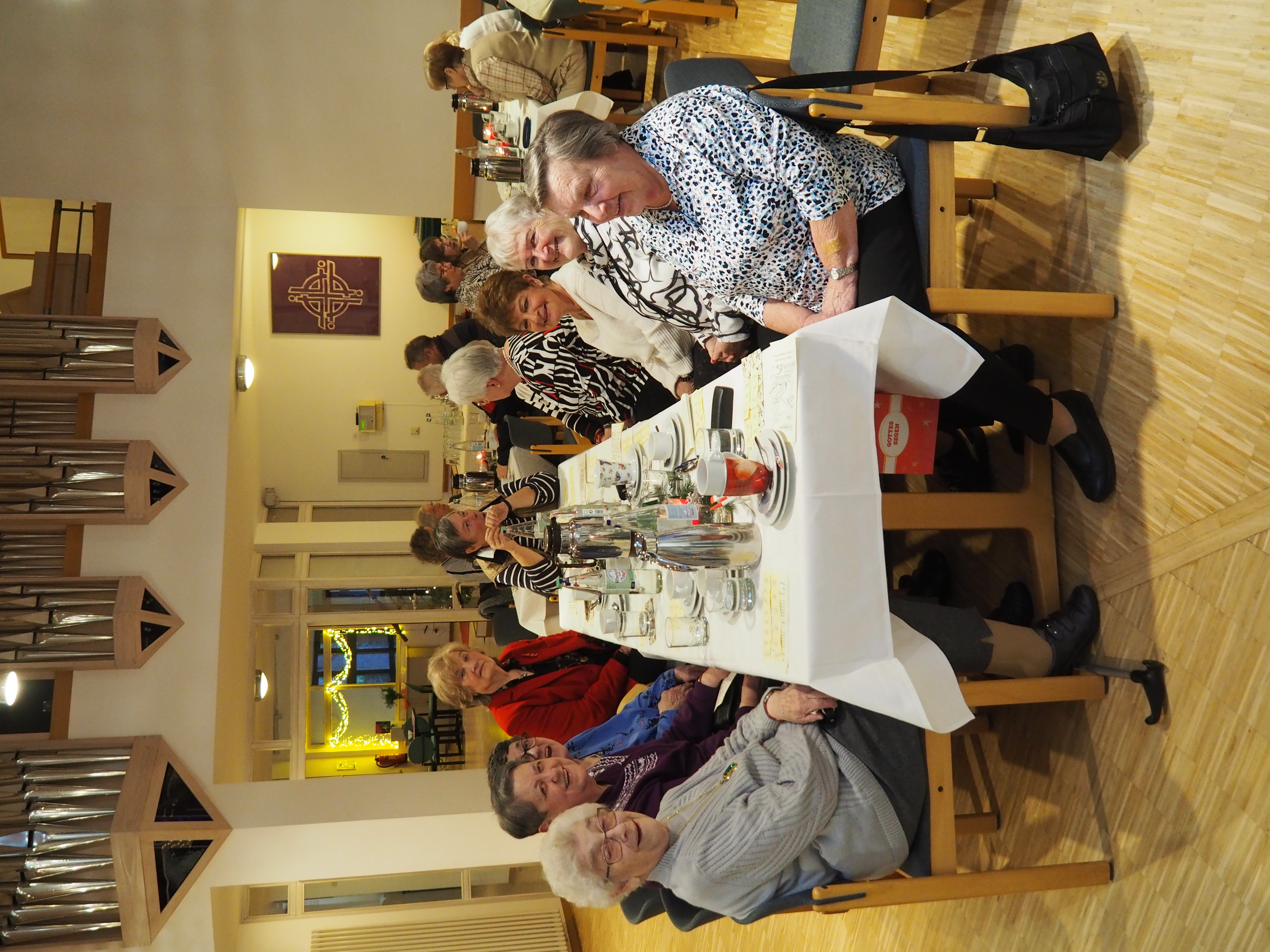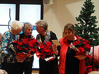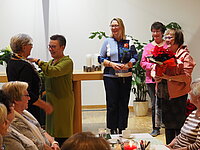 Alle Jubilarinnen erhielten eine Rose bzw. einen Weihnachtsstern. Leider konnten aus gesundheitlichen Gründen nicht alle am Jahresfest teilnehmen, erhalten ihre Ehrungen aber persönlich von ihren Bezirksfrauen. Mit einer Rose und einer Kette begrüßt wurden unsere zwei Neuaufnahmen: Lilo Cörs und Kerstin Mock. Und mit einer Rose ebenso herzlich begrüßt wurden alle, die aus der (leider aufgelösten) Luther-Frauenhilfe nun zu uns in die Gruppe kommen. Nochmals herzlich willkommen! Und einen lieben Gruß und Glückwunsch an alle Jubilarinnen.