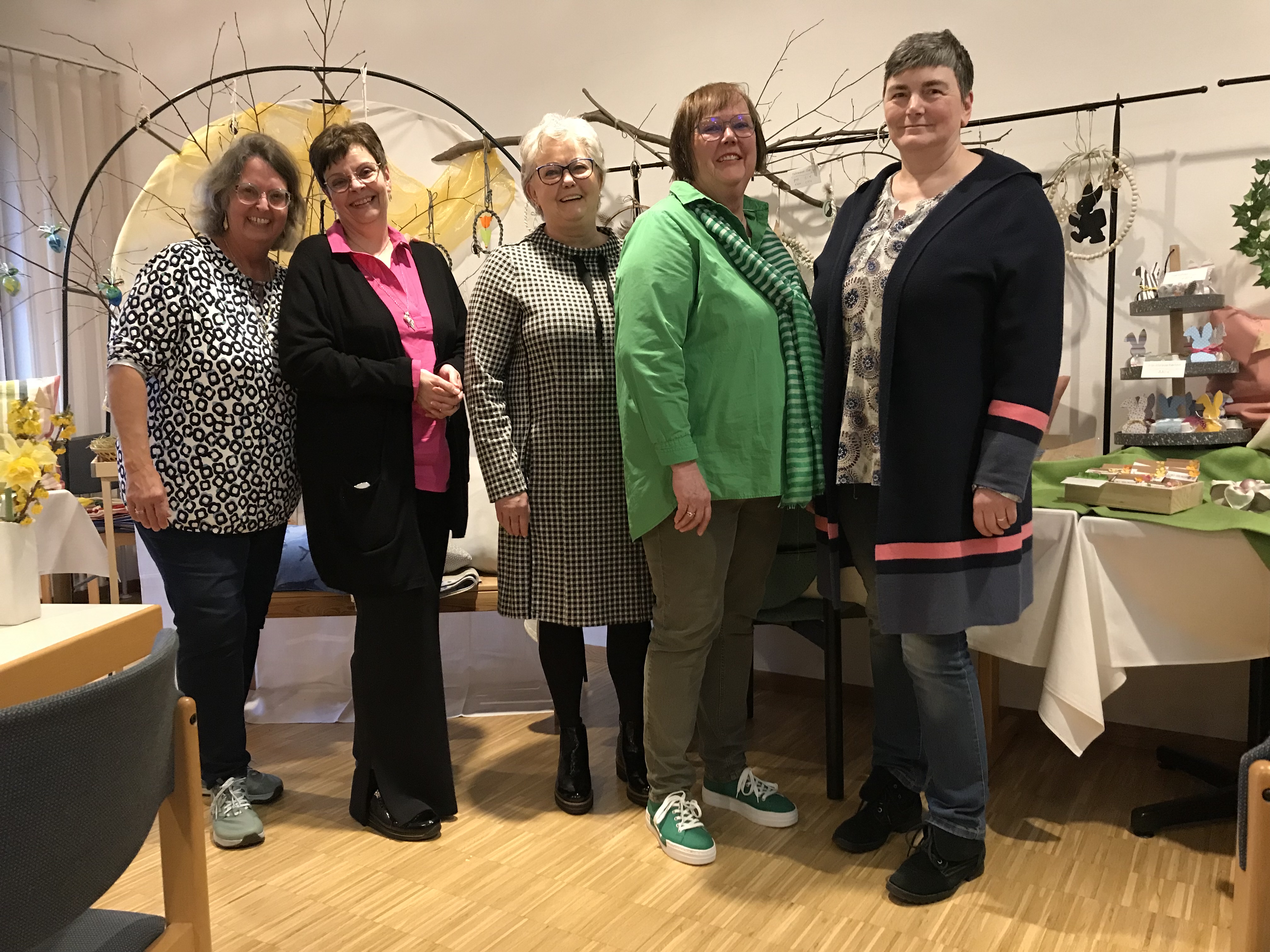 Bei den Vorstandswahlen anlässlich der Jahreshauptversammlung der Ev. Frauenhilfe Langenbochum trat Claudia Sterneberg, die seit 25 Jahren Vorstandsarbeit leistete, davon die letzten 8 Jahre als Vorsitzende, nicht mehr an. Sie wurde von allen berührt und emotional bewegend verabschiedet. Zum Glück geht sie nicht so ganz: sie wird weiterhin das kreative Team leiten, die Basare organisieren und sich auch sonst an vielen Stellen beteiligen und unterstützen. Der neue Vorstand wird alle Aufgaben als „Team“ wahrnehmen, eine explizite Vorsitzende und /oder Stellvertreterin wird es auf Grund beruflicher und privater Verpflichtungen der Vorstandsmitglieder aktuell nicht geben. Das neue (alte) Vorstandsteam – im Foto von links nach rechts – besteht aus: Claudia Grote, Karin Ohm, Heike Koschke, Beate Mohme und Hiltrud Lorenz (Kassiererin). Nicht im Bild ist Ute Lokenvitz, die als stellvertretende Kassiererin neu in den Vorstand gewählt wurde. Begrüßt wurden auch zwei neue Bezirksfrauen: Monika Köster (links) und Elke Marzalla (rechts).