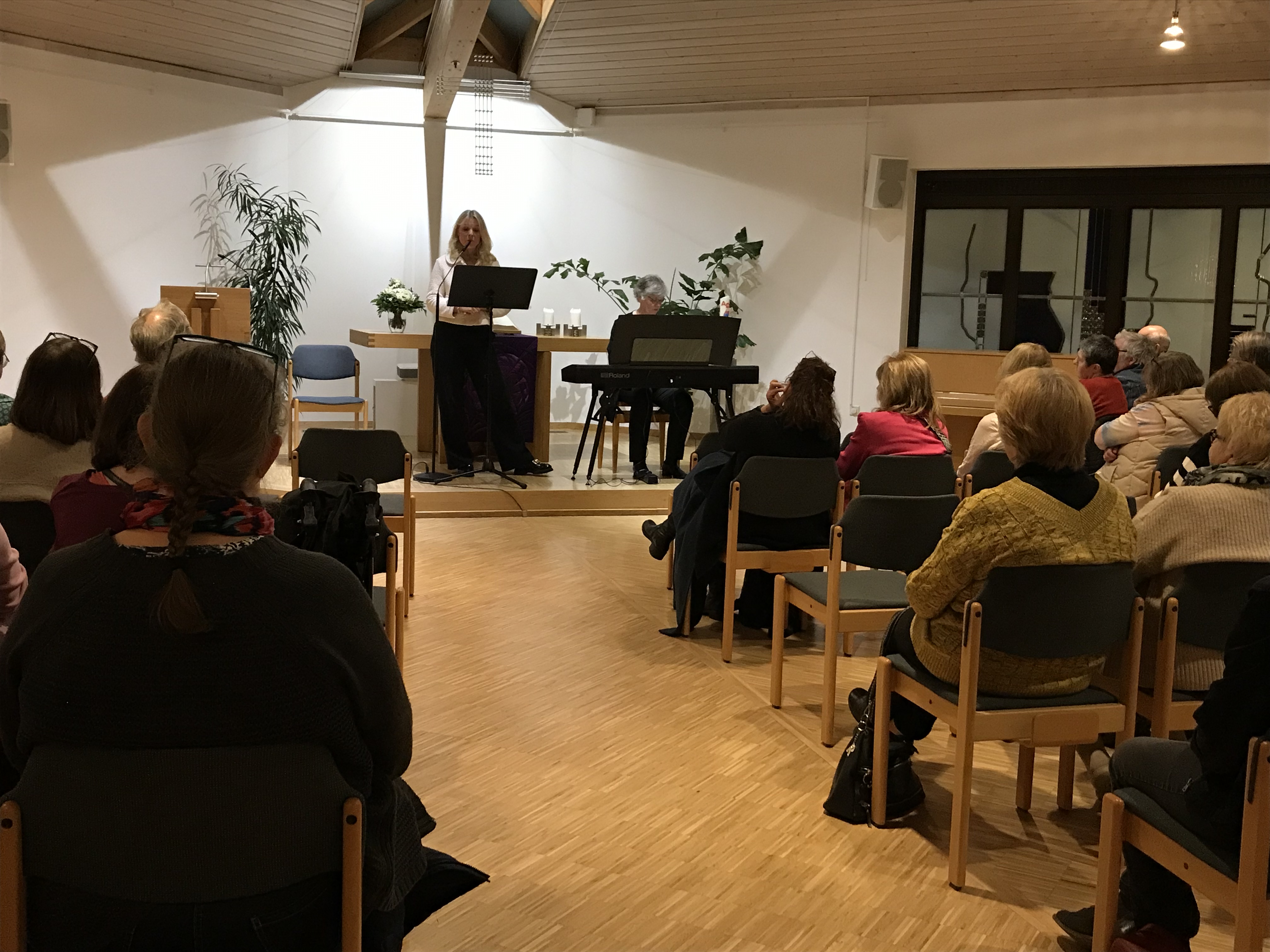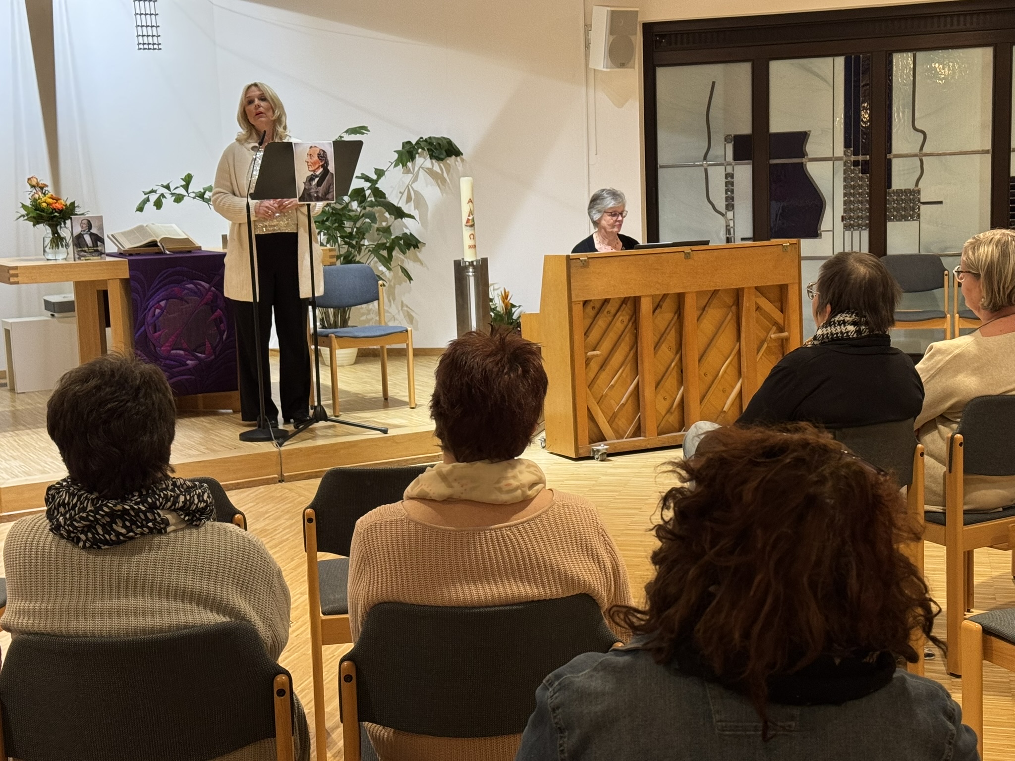 Es war ein berührender Abend. Claudia Wulf vom Duo ReziPian porträtierte Mascha Kaléko so anschaulich und einfühlsam, dass wir meinten, sie wahrhaftig zu treffen und kennenzulernen. Ihre Verse mit einer ganz eigenen Mischung aus romantischer Ironie, liebender Innigkeit und politischer Schärfe bewegten die Anwesenden sehr. Beeindruckend, welch ein Leben sie angesichts der damaligen Zeit und Umstände führte. Und Andrea Sauer fing mit ihrem gekonnten Klavierspiel und der abgestimmten Auswahl an Liedern und Kompositionen die jeweilige Atmosphäre sehr passend ein. Eingestimmt auf die Lesung haben sich viele bereits bei einem gemeinsamen Abendimbiss vorher. Nach der Lesung blieb viel Zeit, mit den Referentinnen und vor allem auch untereinander ins Gespräch zu kommen, wovon ausgiebig und lebhaft Gebrauch gemacht wurde.