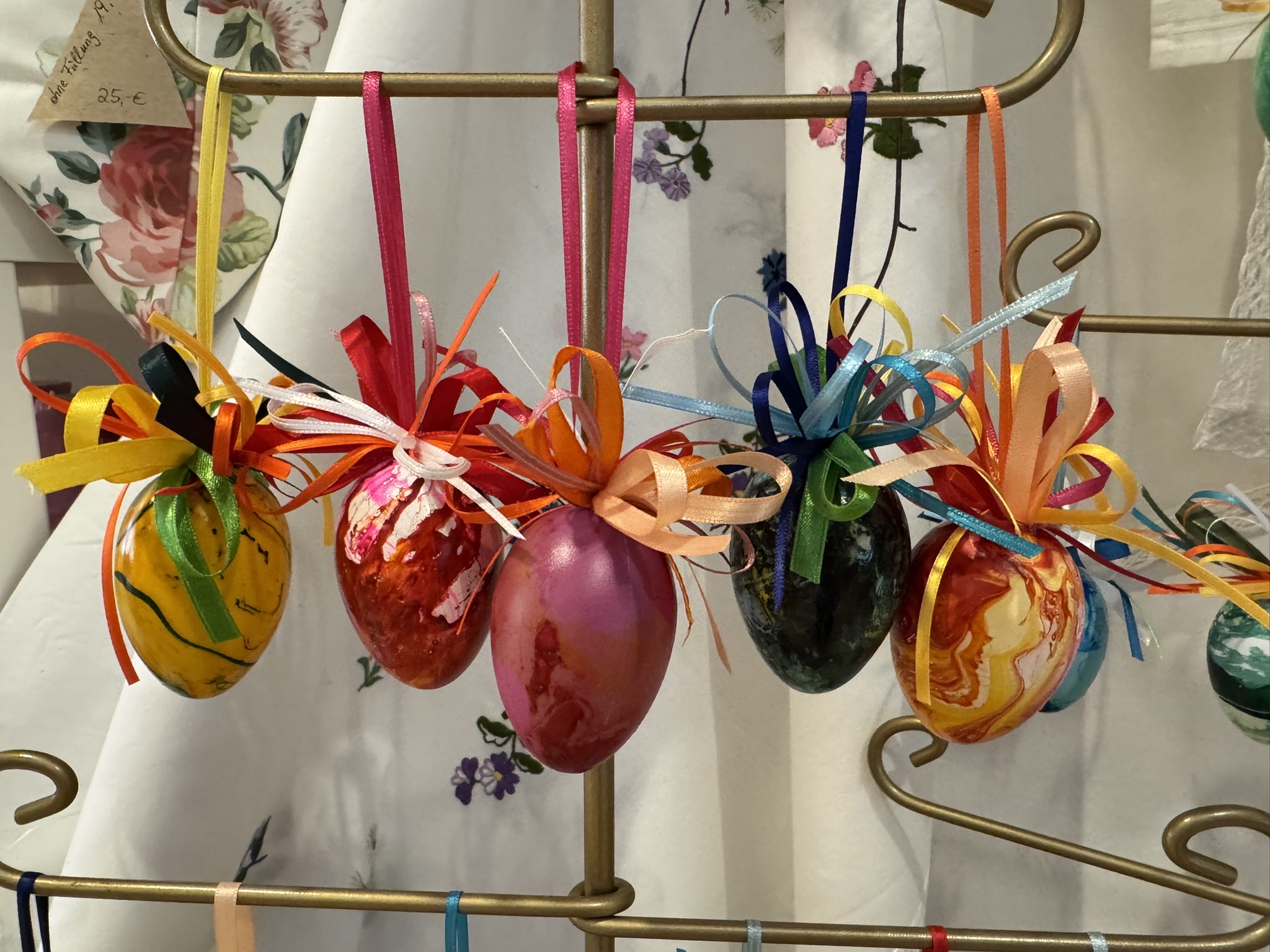 (Zunächst!) vorbei am reichhaltigen Tortenbuffet führt der Weg direkt an die Basartische – ansprechend und liebevoll dekoriert vom kreativen Team um Claudia Sterneberg. Direkt oder auch etwas später zum Vernaschen: das große Angebot an Traditionell-Beliebtem wie gebackenen Lämmern und Häschen, Ameisen- und Möhrenkuchen, neue Keksrezepte, Gelees und andere Küchenkreationen. Zum Stöbern und Verschenken – oder auch selber behalten: Tischdekorationen, handgenähte Schürzen, individuelle Tischdecken und Kissenhüllen, Gruß- und Glückwunschkarten, zahllose Ideen zum nett verpackten Verschenken von Geld oder Gutscheinen, Schmetterlinge und Gartenzwerge, geschmückte Eier, Bommel-Häschen und viele weitere Überraschungen.