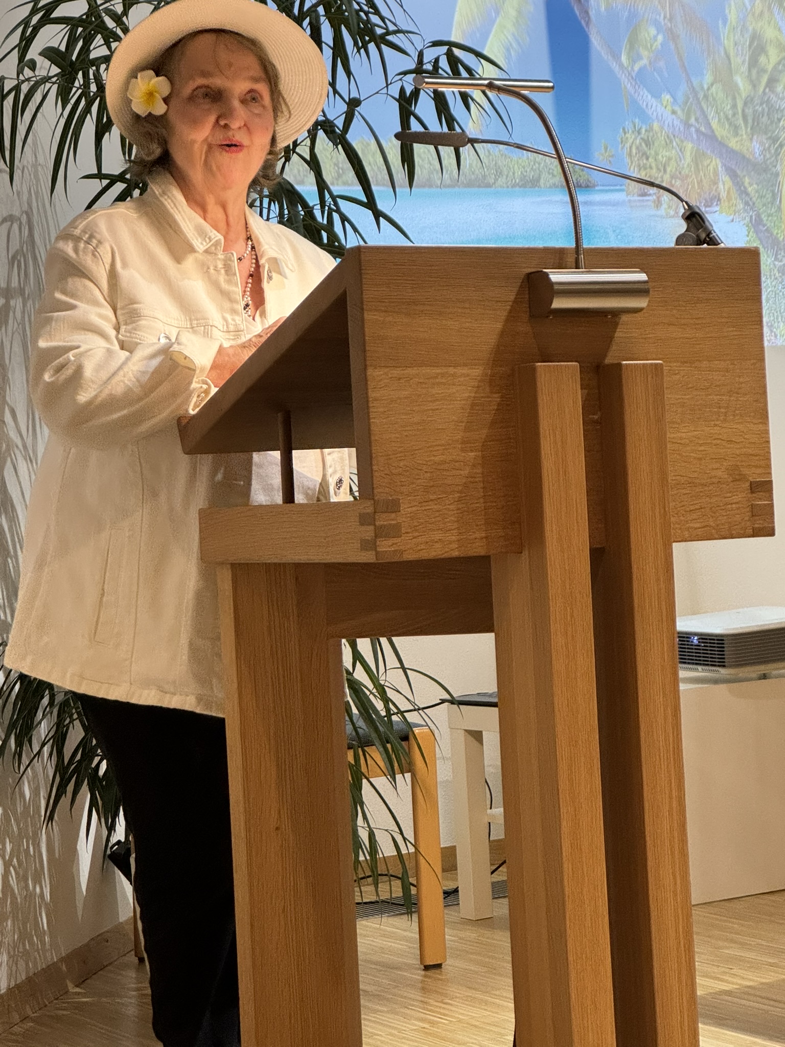 Claudia Montanus vom Landesverband der Ev. Frauenhilfe in Westfalen fesselte mit ihrer kenntnisreichen und lockeren Art von Anfang an die Freundinnen (und einen Freund), die sich im Gemeindezentrum Ackerstraße trafen. Ihre Schilderungen zum Leben und Wirken von Astrid Lindgren zogen alle in ihren Bann. Kein Wunder, dass die ursprünglich geplante Pause mit Imbiss statt 20 Minuten dann eine Stunde dauerte – so lebhaft entspannen sich Gespräche und Diskussionen. Claudia Montanus gelang es in ihrer unnachahmlichen Art, den Bogen zu spannen von Astrids Leben zu ihren bekannten und beliebten Kinderbüchern mit humorigen Zitaten, dem gemeinsamen Singen von „Hey, Pippi Langstrumpf“ hin zum mehr als aktuellen Bezug zum Krieg in der Ukraine und anderswo: nein, nicht überall ist Bullerbü.